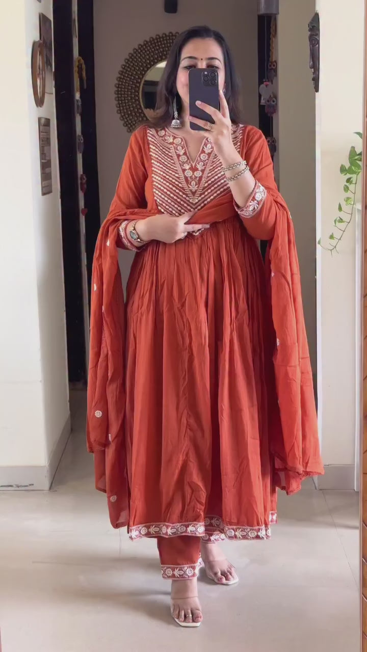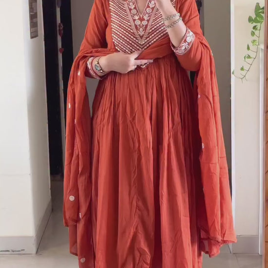 Rust Orange Embroidered Cotton Anarkali Set with Dupatta